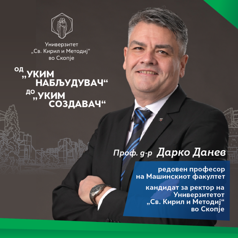 Проф. д-р Дарко Данев е редовен професор на Машинскиот факултет при УКИМ, со долгогодишно искуство во настава, наука и управување. Својата академска кариера ја гради од асистент до редовен професор, со активно учество во научни и апликативни проекти.